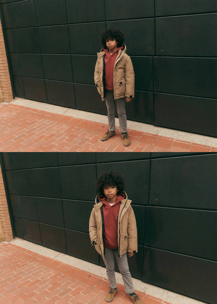 Back to school collection. Front closure. Quilted design. Hood. Straight design. Long sleeves. With filling. Two side pockets with buttoned flaps. Zip closure