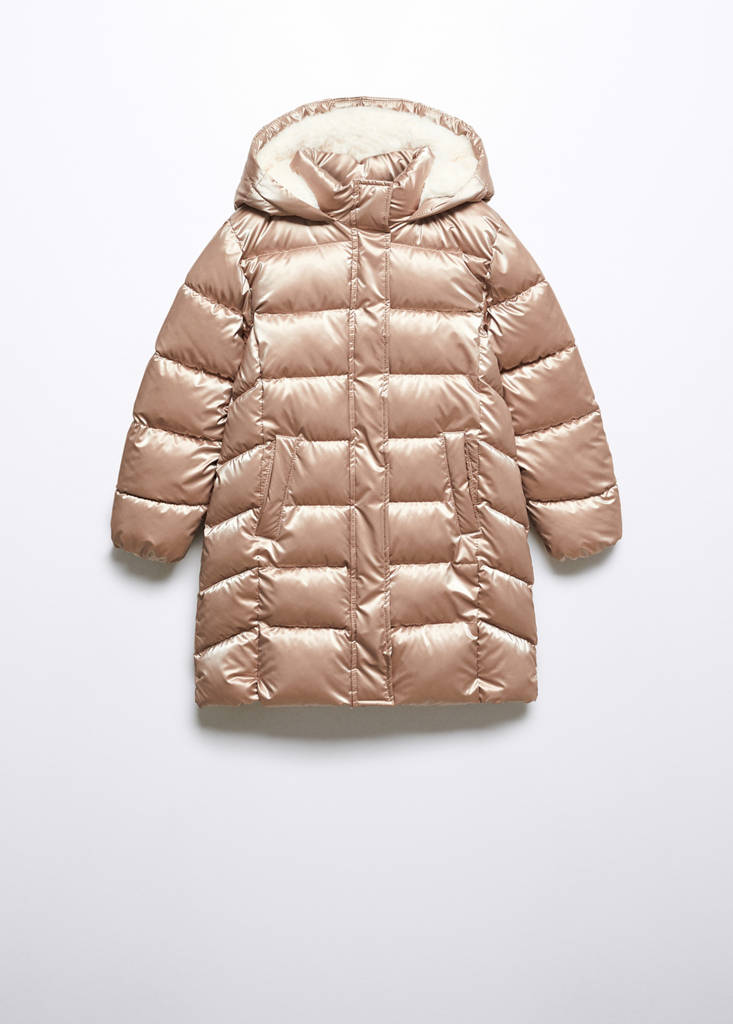 Metallic detail. Long design. Quilted design. Straight design. Fur-effect lining. Long sleeves. Hood. Two pockets with flaps. Front closure. Zip fastening. Internal label for personal data