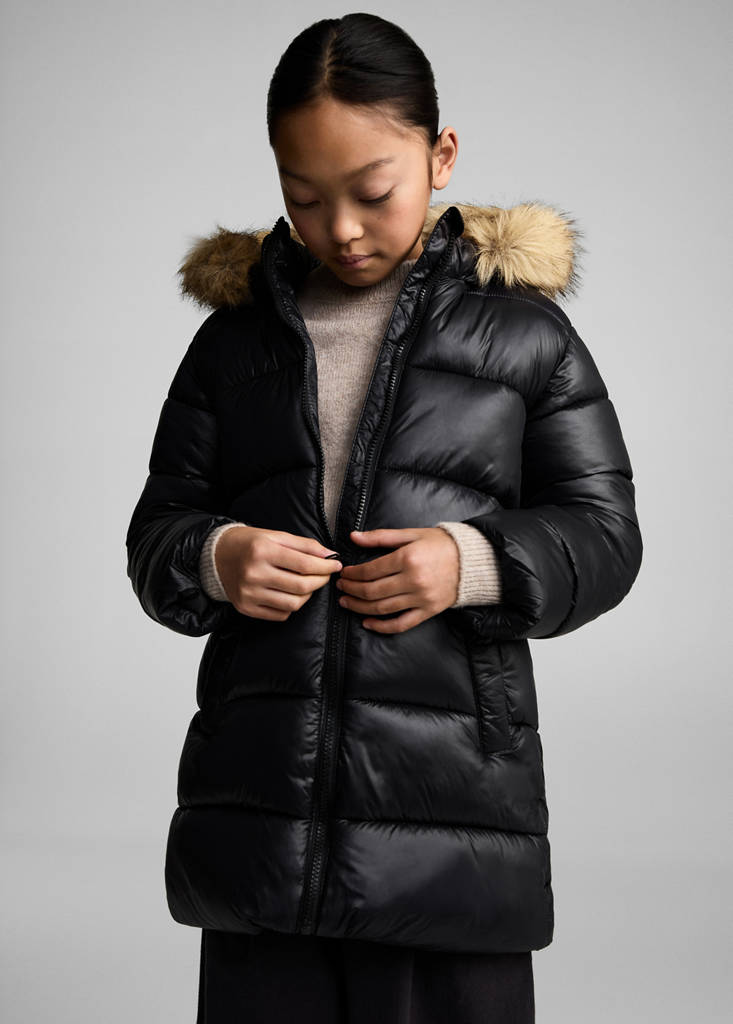 Straight design. Hood with synthetic hair detail. Long sleeves. Two side pockets. Front zip closure. Quilted design