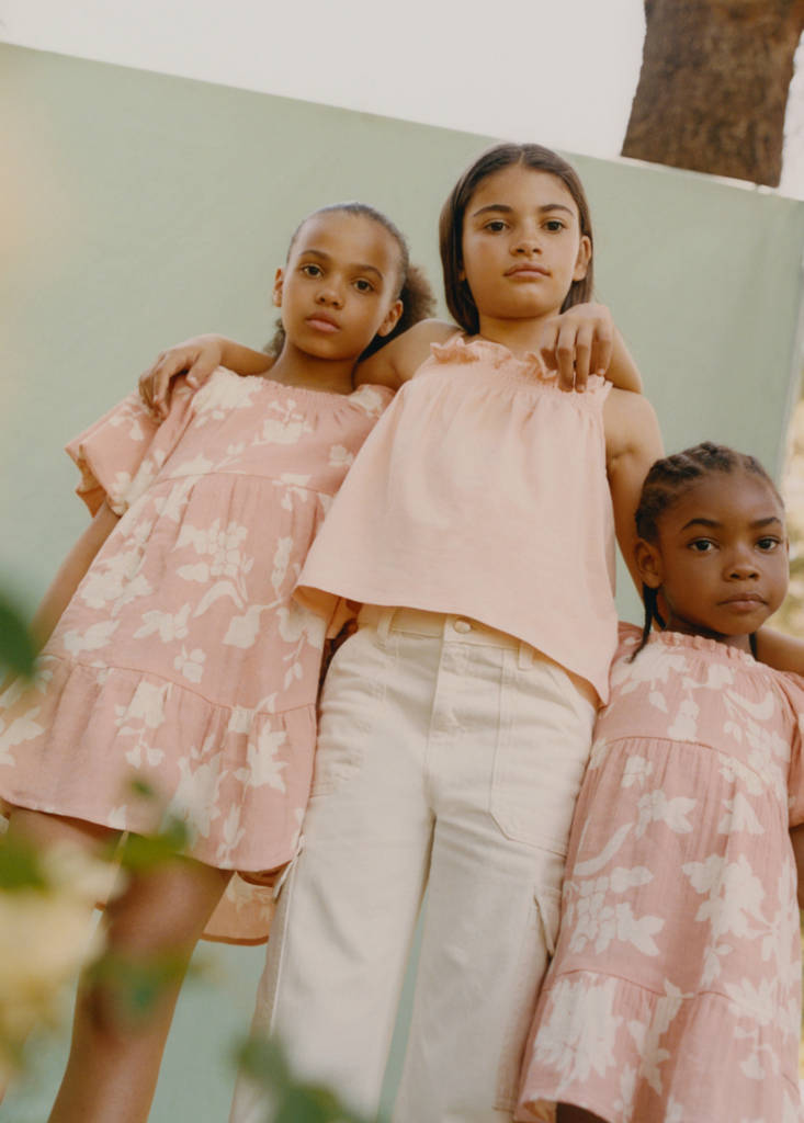 Floral print, short design, gathered details, wide sleeve, short sleeve, ruffles on the hem, rounded neck.