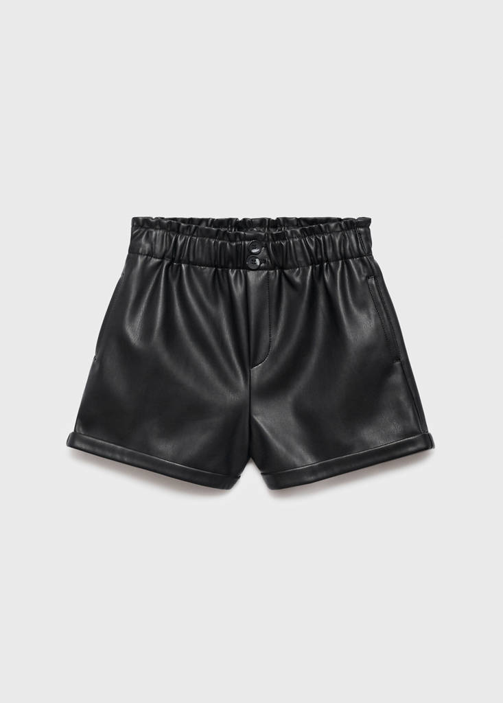 Leather-effect fabric. Faux leather. Short design. Gathered Waist. Elasticated waist. Decorative button detail