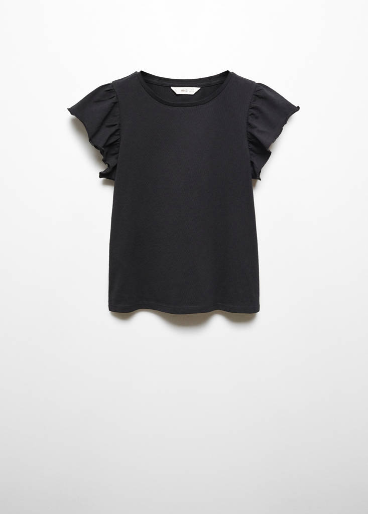 Short-sleeved ruffle t-shirtCurrent price [US$ 12.99 ]US$ 12.99Select a colourBlackSelect your size5-6 years (116cm)7-8 years (128cm)9-10 years (140cm)11-12 years (152cm)13-14 years (164cm)DimensionsAdd to WishlistSee lookFree delivery to storeStraight design. Ruffles on the sleeves. Short sleeves. Round neck. Lightweight fabric. No FasteningDetails, composition and careStore availabilityItem qualitiesRecycled cottonAt least 20%This fibre is obtained from pre- and post-consumer textile waste that is transformed into new fabrics.
