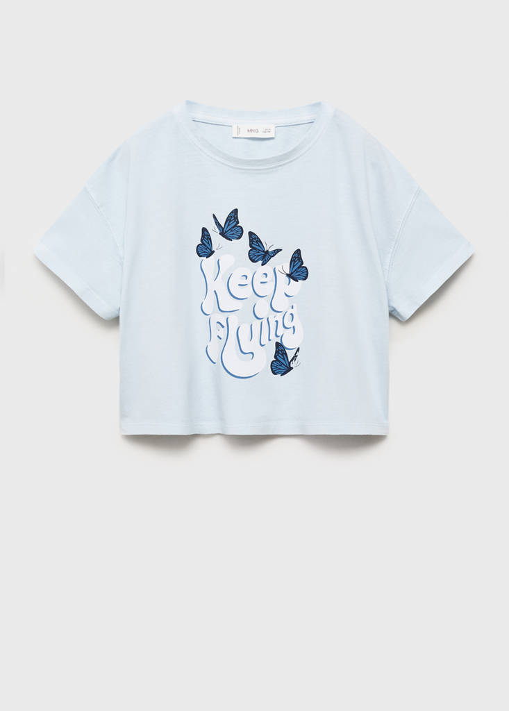 Printed cropped t-shirtCurrent price [US$ 22.99 ]US$ 22.99Select a colourSky BlueSelect your size5-6 years (116cm)7-8 years (128cm)9-10 years (140cm)11-12 years (152cm)13-14 years (164cm)DimensionsAdd to WishlistSee lookFree delivery to store100% Cotton. Straight design. Short design. Round neck. Short sleeves. Embroidered drawing on the chest. Printed drawing on the backDetails, composition and careStore availabilityItem qualitiesRecycled cottonAt least 20%This fibre is obtained from pre- and post-consumer textile waste that is transformed into new fabrics.