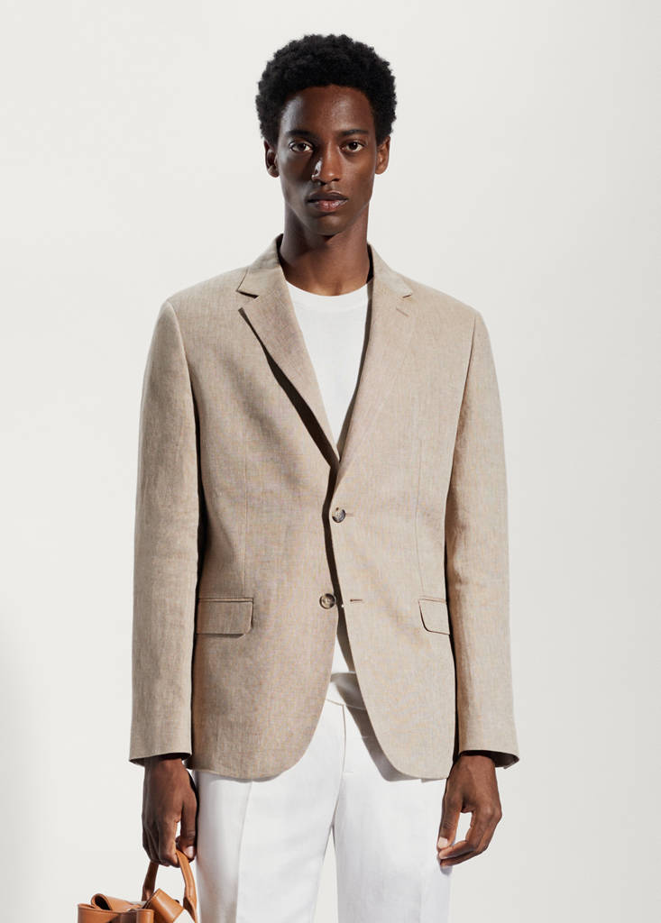 Slim fit. Front closure. Long sleeves. Lapel with notch. Button fastening at the front. Standard design. Regular neck. Lining only. Lightweight fabric. 100% linen fabric. Two pockets with flaps on the front. Long sleeves with buttoned cuffs. Double back slit. Straight hem. Inner lining. Three inside pockets