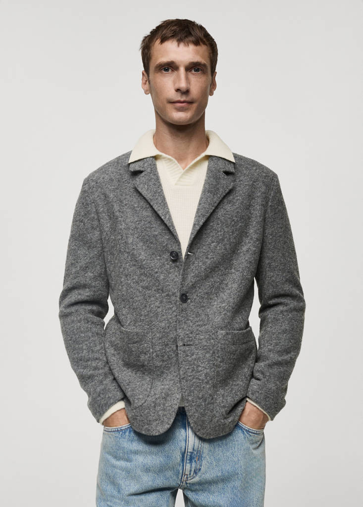 Wool mix fabric. Flecked design. Notched lapel collar. Button up. Slim fit. Straight hem. Recycled materials. Two side patch pockets. Inner lining on sleeves. Hem with two side slits