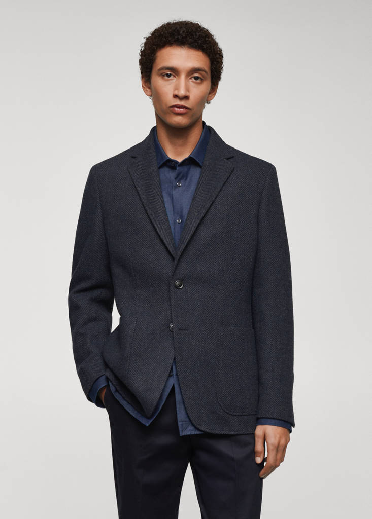 Slim fit. Recycled wool and polyester blend fabric. Notched lapel collar. Patch pocket on the front. Long sleeves. Straight hem. Partial lining. Interior pocket. Front closure with buttons. Herringbone fabric