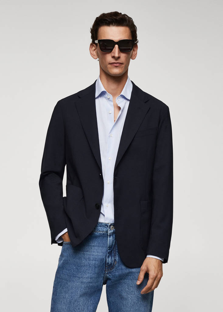 Virgin wool blend fabric. Lightweight fabric. Slim fit. Notched lapel collar. Chest welt pocket. Two patch pockets at the front. Long sleeves with buttoned cuffs. Straight hem. Double back slit. Partial lining. Interior pocket with button closure. Front closure with buttons