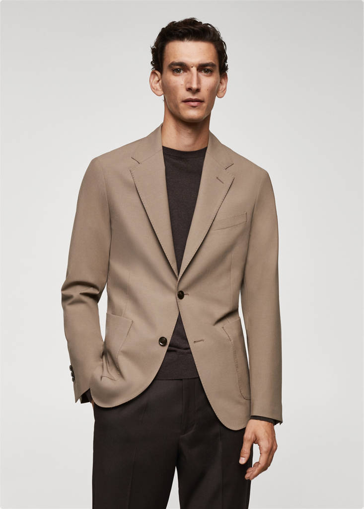 Virgin wool blend fabric. Lightweight fabric. Slim fit. Notched lapel collar. Chest welt pocket. Two patch pockets at the front. Long sleeves with buttoned cuffs. Straight hem. Double back slit. Partial lining. Interior pocket with button closure. Front closure with buttons