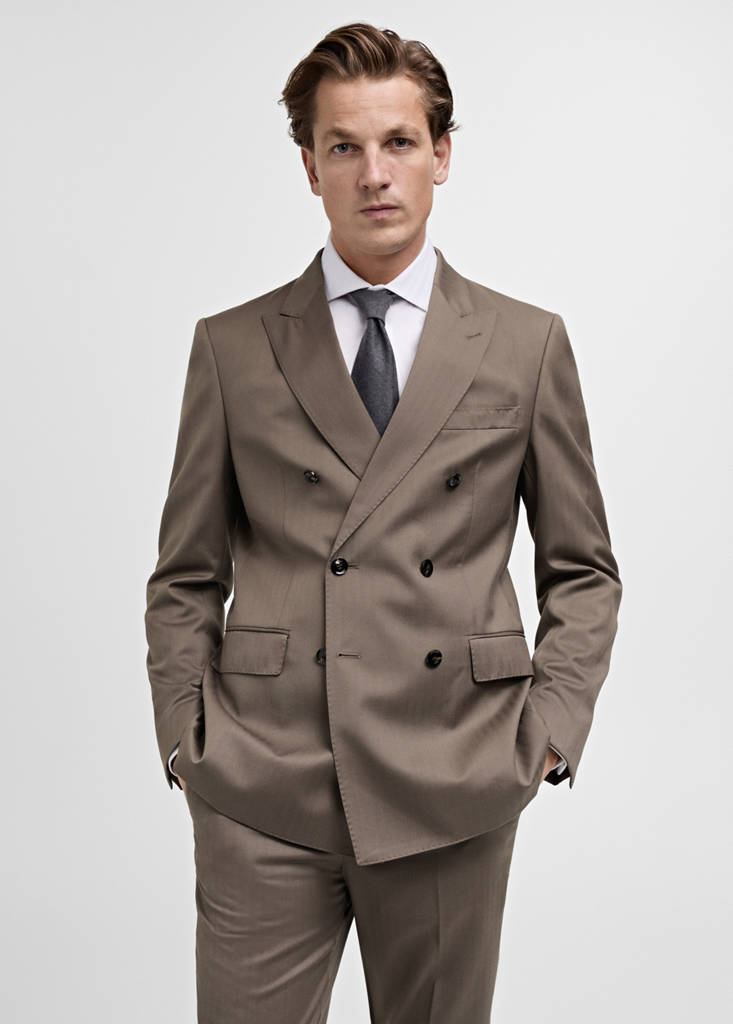Slim fit. 100% Italian virgin wool fabric. Peak-lapel collar. Herringbone structure. Front closure with crossed buttons. Chest welt pocket. Two front welt and flap pockets. Long sleeves with buttoned cuffs. Double back vent at the hem. Inner lining. Interior pocket