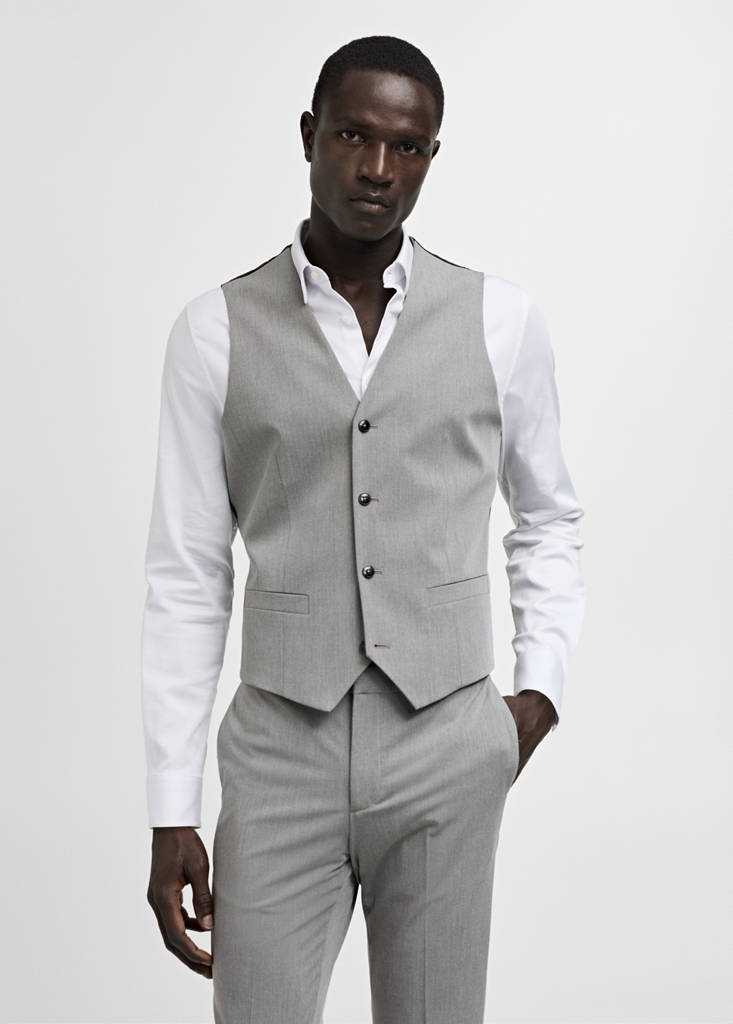 Super slim fit. Comfort Stretch: Stretch fabric for added comfort. V-neck. Sleeveless. Adjustable buckle on the back. Inner lining. Interior pocket. Tailoring collection. Comfort: Horizontal and vertical stretch fabric for added comfort. Two front welt pockets. Front closure with buttons