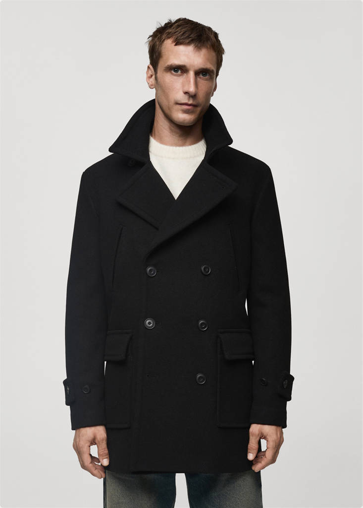 Regular fit. Recycled wool mix fabric. Notched lapel collar. Front closure with crossed buttons. Two welt pockets on the chest. Two patch pockets with flap on front side. Buttoned cuffs. Inner lining. Two inside welt pockets. Opening in the central part of the hem