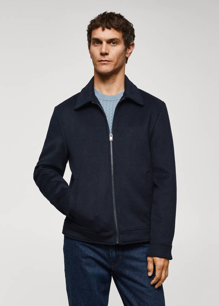 Recycled wool mix fabric. Regular fit. Straight design. Shirt collar. Front zip closure. Long sleeves with buttoned cuffs. Straight hem. Inner lining. Interior pocket. Two front welt pockets