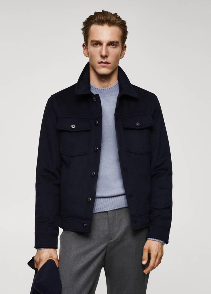 Wool mix fabric. Slim fit. Quilted design. Shirt collar. Front closure with metal buttons. Twin buttoned flap pockets at front. Two side pockets. Long sleeves with buttoned cuffs. Straight hem