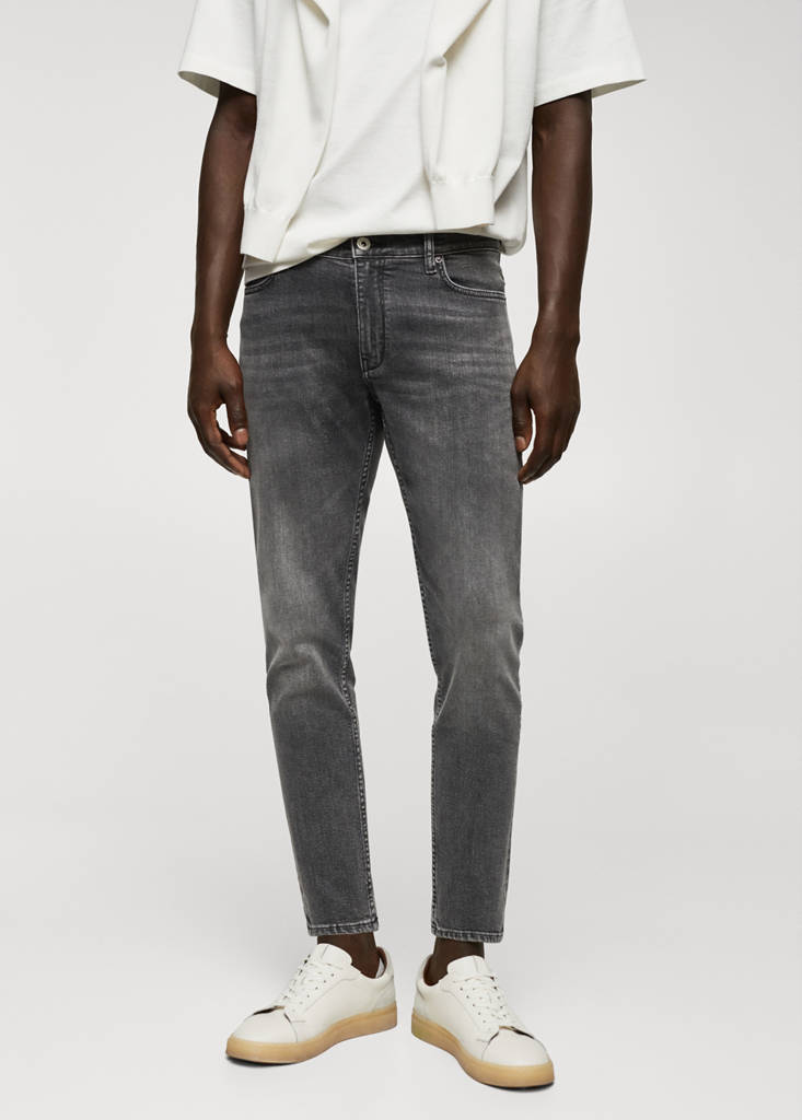 Tapered fit: wide cut at the top that narrows from the knee to the ankle. Crop style. Cotton and lyocell blend fabric. Light grey wash. Five pockets. Belt loops. Zip and button fastening. Denim jeans style. The model is wearing a size 42