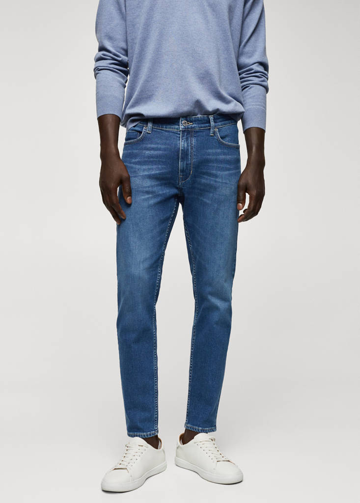 Tapered fit: wide cut at the top that narrows from the knee to the ankle, crop style, cotton and lyocell blend fabric, medium wash, five pockets, belt loops, zip and one button fastening, denim jeans style, the model is wearing a size 42.