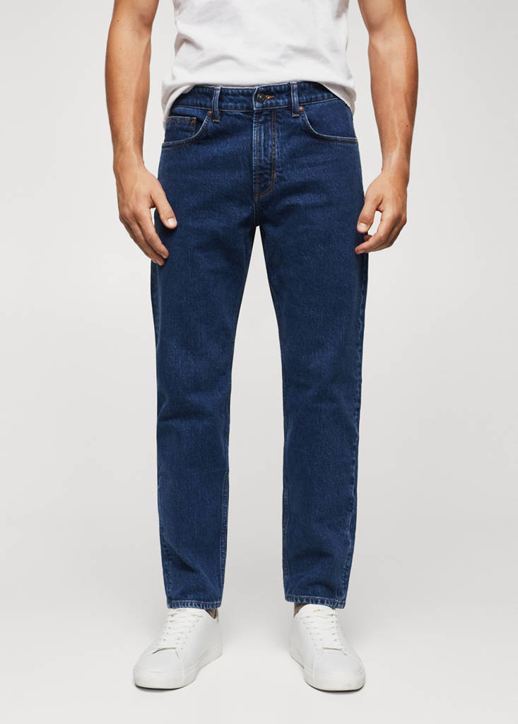 ESSENTIALS: Made to last. Cropped design. Tapered fit: wide cut at the top that narrows from the knee to the ankle. Sustainable cotton blend fabric. Denim style cotton fabric. Ecru . Loops. Two side pockets. Coin pocket. Two patch pockets on the back. Zip and one button fastening. The model is 187 cm tall and is wearing a size 42. Denim jeans style
