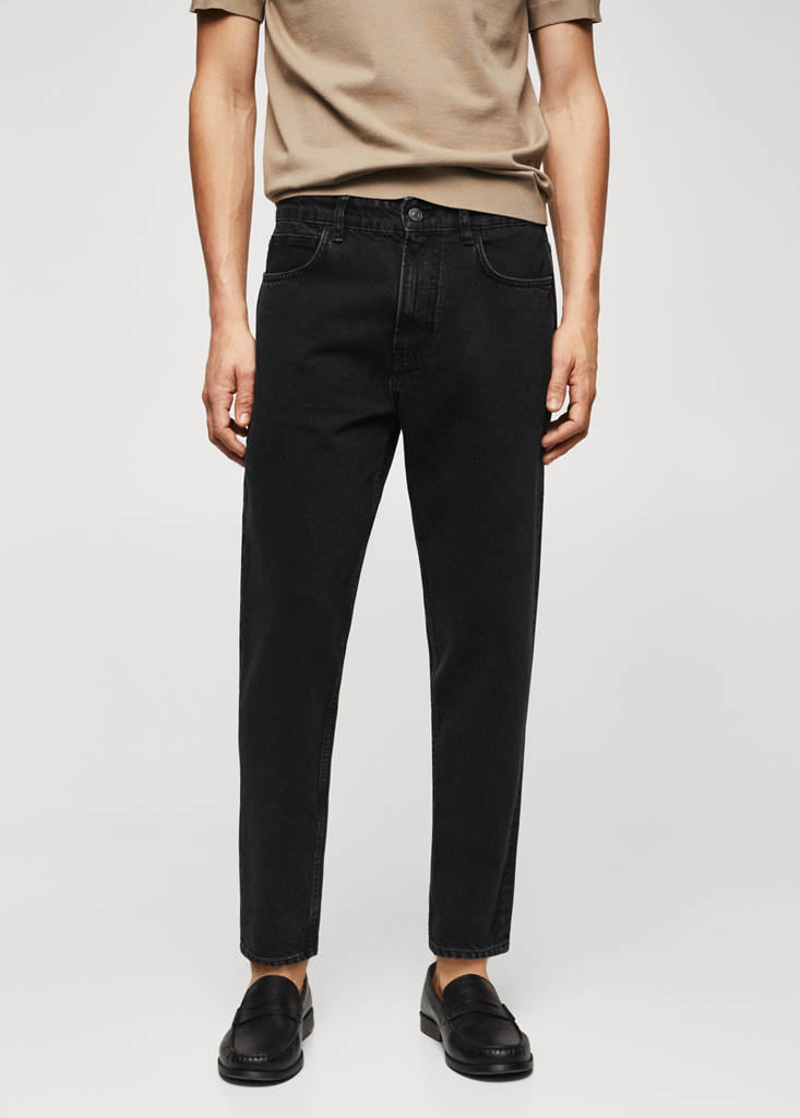 Tapered fit: wide cut at the top that narrows from the knee to the ankle. Crop style. Denim fabric. Recycled cotton-blend fabric. Zip and one button fastening. Two front pockets. Coin pocket. Two patch pockets on the back. Straight hem. Denim jeans style
