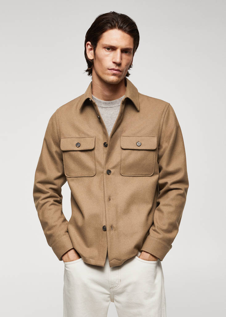 Standard design. Regular fit. Wool mix fabric. Flannel fabric. Shirt collar. Twin buttoned flap pockets at front. Long sleeves with buttoned cuffs. Rounded base. Front closure with buttons