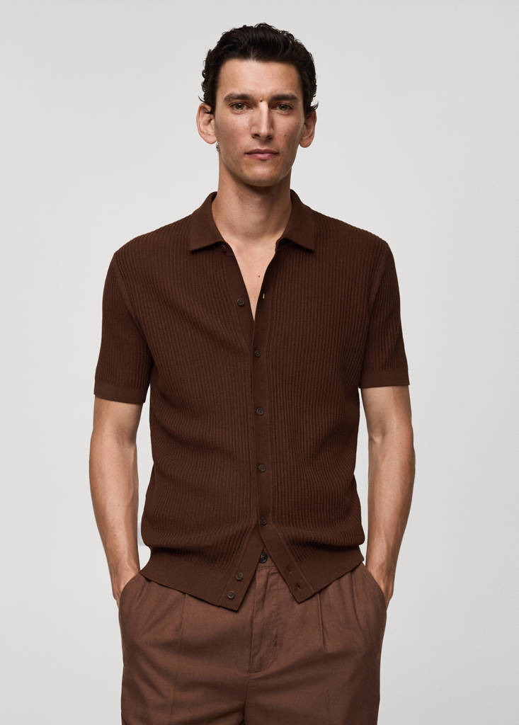 Fine-knit fabric. Regular fit. Braided ribbed structure. Shirt collar. Short sleeves. Straight hem. Front closure with buttons. Front closure. Standard design. Straight design. Polo collar. 100% cotton fabric