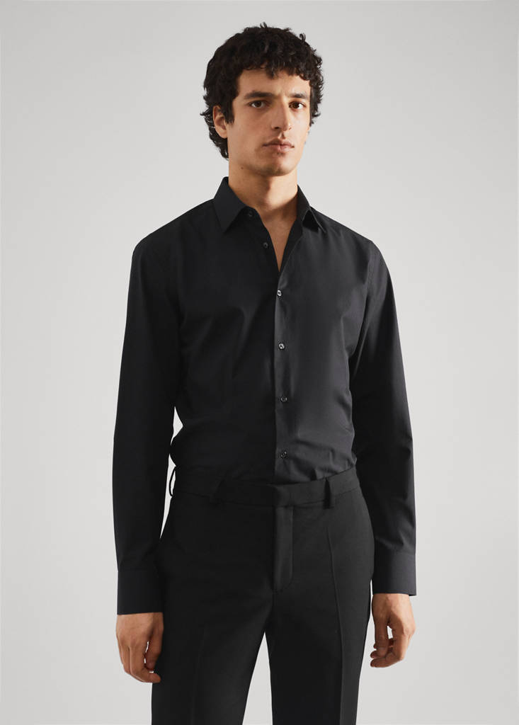 Slim fit. Stretch cotton fabric. Easy iron. Cutaway collar. Long sleeve with buttoned cuffs. Button fastening on the front section. The model is 185 cm tall and is wearing a size M