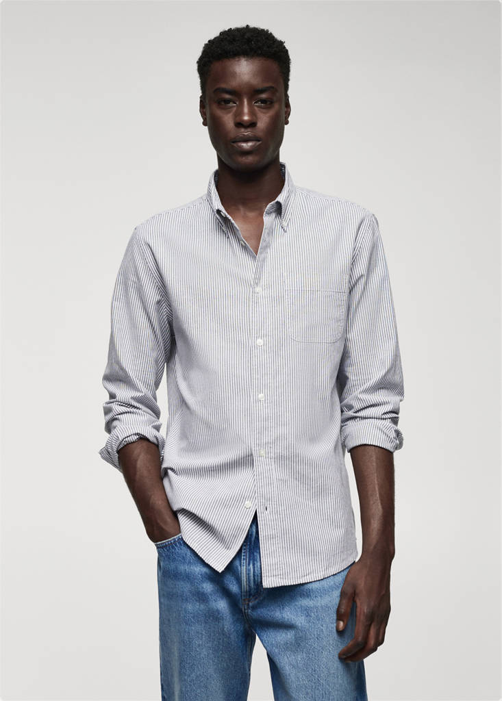 ESSENTIALS: Made to last. Regular fit. Bengal stripe design. American button-down collar. Patch pocket on the chest. Long sleeves with buttoned cuffs. The purple models is an online exclusive. Rounded base. 100% cotton fabric. Front closure with buttons