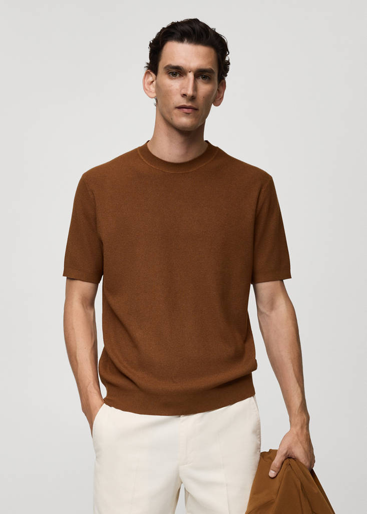 Structured knitted t-shirtInitial price struck through [US$ 59.99 ]US$ 59.99Current price [US$ 47.99 ]US$ 47.99-20%Select a colourCoffeeSelect your sizeSMLXLXXLDimensionsAdd to WishlistSee lookFree delivery to storeFine-knit fabric with micro-structure. Straight design. Round neck. Short sleeves. Straight hem. Untrimmed hemDetails, composition and careStore availability