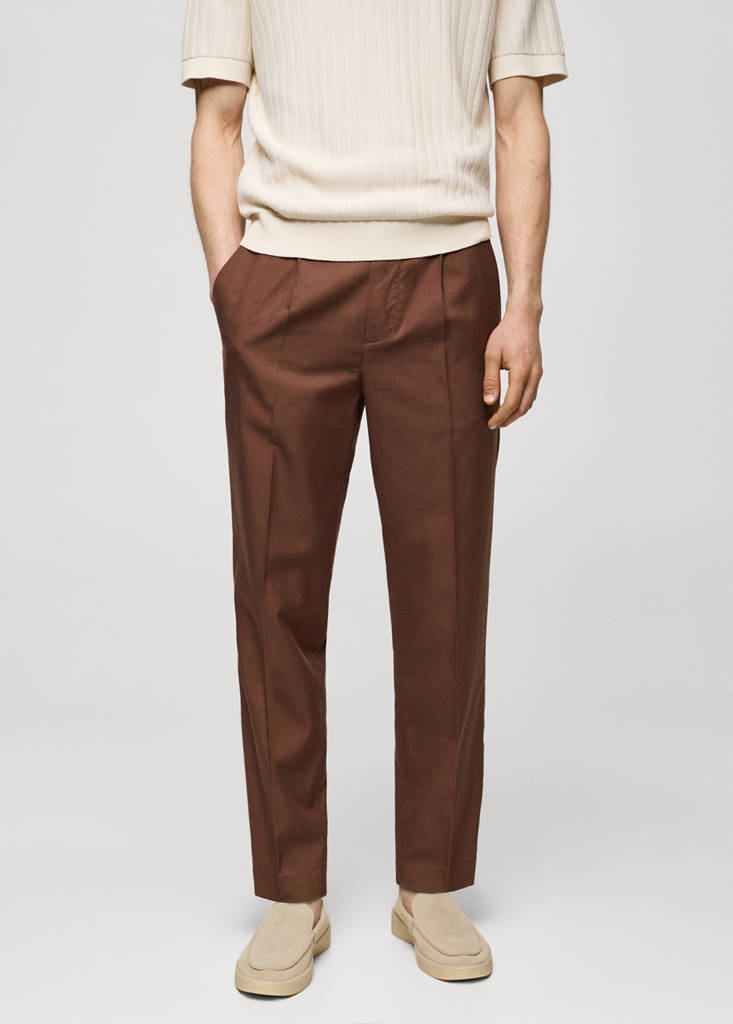 Front pleat detail. Belt loops. Front fastening with double-breasted buttons and zip. Two front pockets. Two welt pockets with button at the back. Lyocell, cotton and linen-blend fabric. Pressed crease detail at the front and back