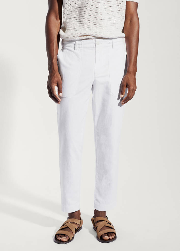 Regular fit. Cotton and linen blend fabric. Elasticated waistband. Interior or exterior adjustable cord. Loops on the waist. Double button and zip closure. Two patch pockets at the front. Patch pocket with button closure. Jacket set available