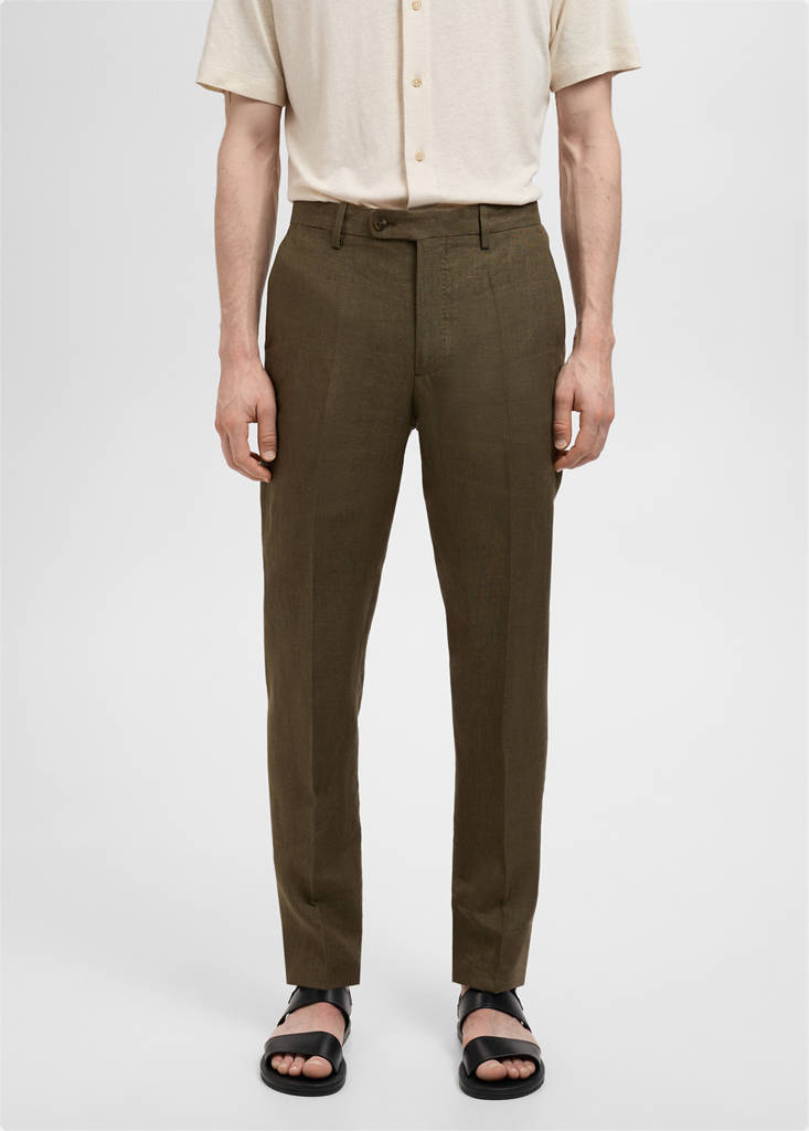 Slim fit. 100% linen fabric. Belt loops. Tailoring collection. Front fastening with double-breasted buttons and zip. Coin pocket. Two side pockets. Two welt pockets with button at the back. Pressed crease detail at the front and back