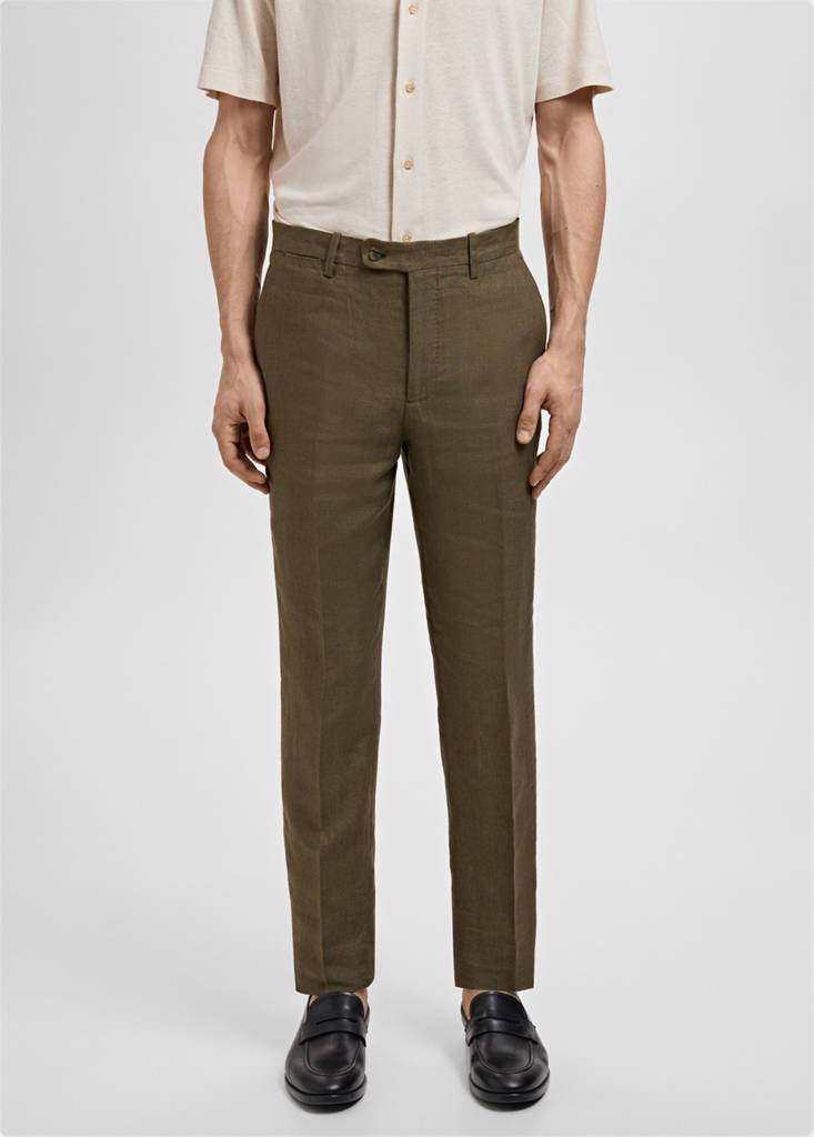 Slim fit. 100% linen fabric. Belt loops. Tailoring collection. Front fastening with double-breasted buttons and zip. Coin pocket. Two side pockets. Two welt pockets with button at the back. Pressed crease detail at the front and back