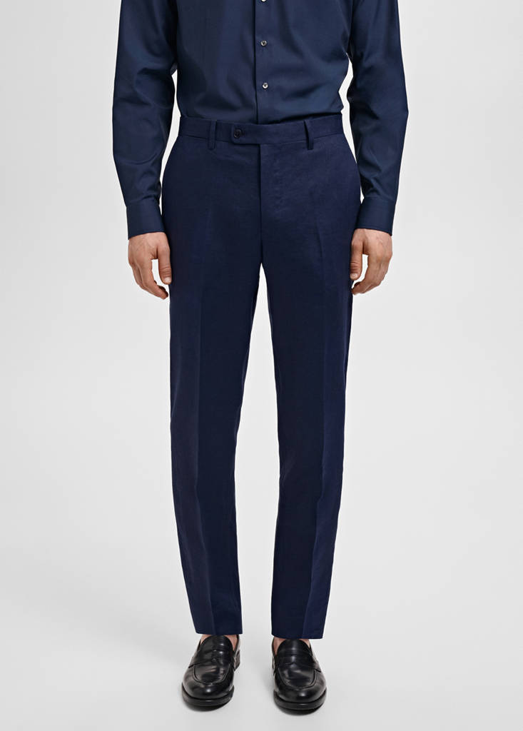 Slim fit. 100% linen fabric. Tailoring collection. Belt loops. Front fastening with double-breasted buttons and zip. Coin pocket. Two side pockets. Two welt pockets with button at the back. Pressed crease detail at the front and back