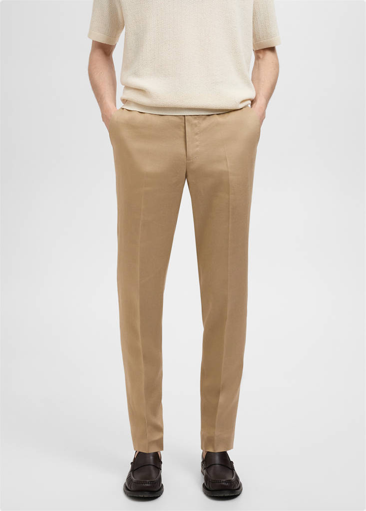 Slim fit. 100% linen fabric. Tailoring collection. Belt loops. Front fastening with double-breasted buttons and zip. Coin pocket. Two side pockets. Two welt pockets with button at the back. Pressed crease detail at the front and back