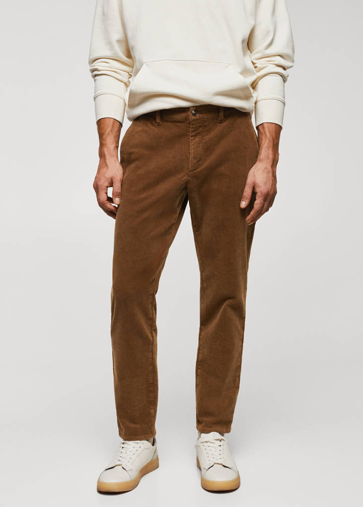 Slim fit. Cotton blend fabric. Micro corduroy. Crop design. Zip and button fastening. Belt loops. Waist with adjustable inner cord. Two front pockets. Two welt pockets with button at the back