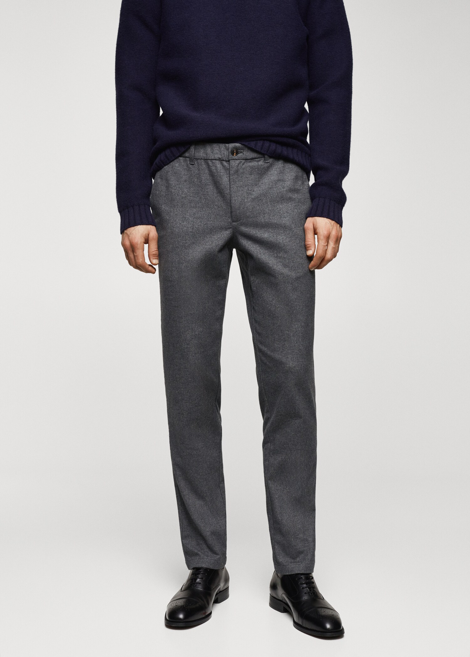 Slim fit. Cotton-blend fabric. Structured fabric. Double button and zip closure. Belt loops. Elastic gathering at the back of the waistband. Two front pockets. Coin pocket at hip height. Two welt pockets with button on the back. The model is 190 cm tall and is wearing a size 42.