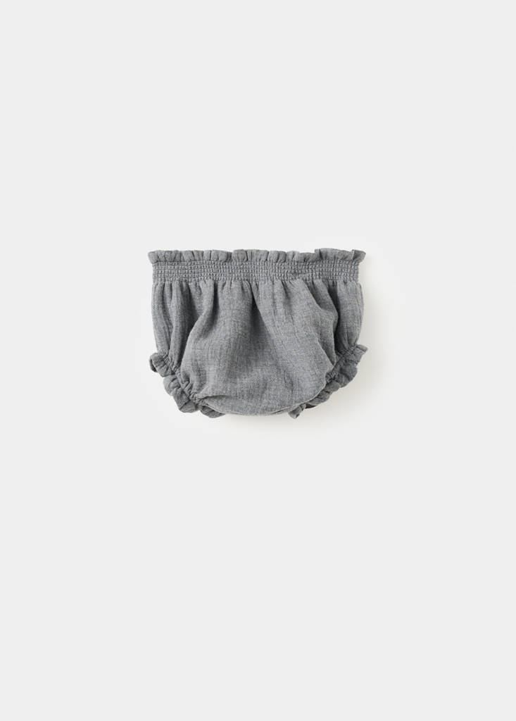 100% cotton fabric. Short design. Straight design. Gathered panel at the waist. Elasticated waist. Elastic finish