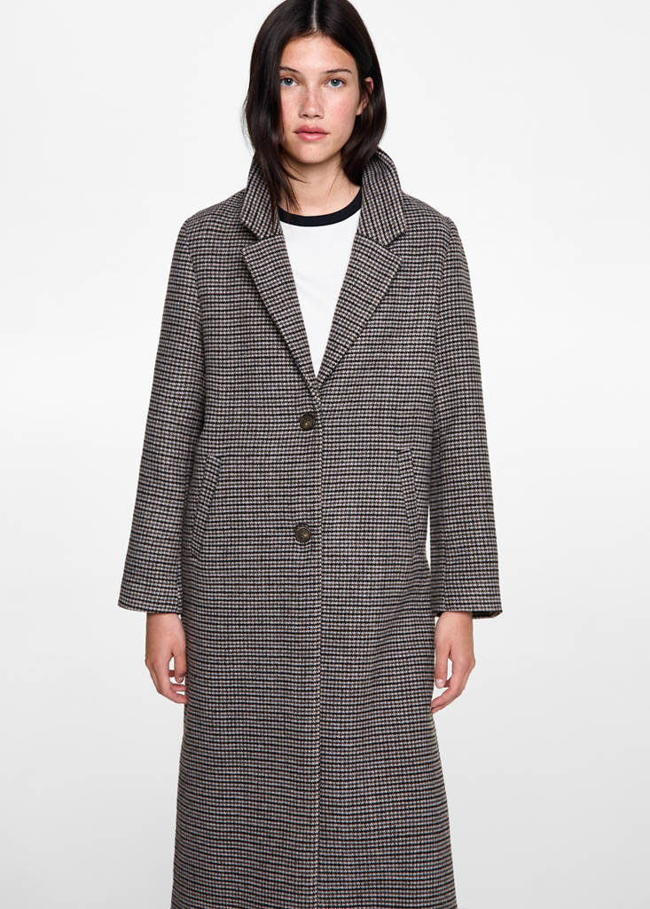 Straight design. Long sleeves. Shirt collar. Two side pockets. Front closure with buttons. Back to class. Woven with wool. Houndstooth design
