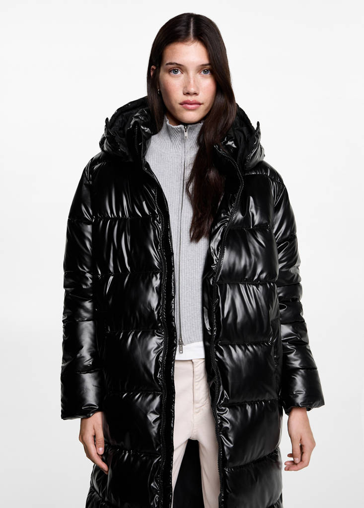 Quilted design. Straight design. Long design. Hood with button closure. Two side pockets. Zip closure