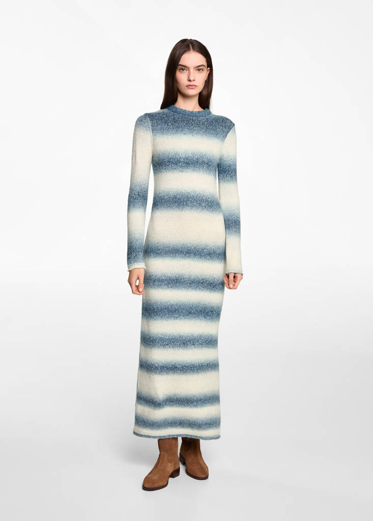 Knit fabric. Straight design. Ombre design. Striped design. Round neck. Long sleeves. Long design