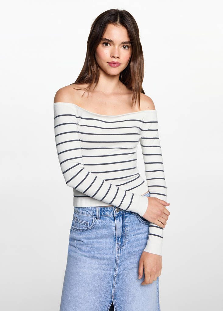 Striped boat-neck sweaterCurrent price [US$ 39.99 ]US$ 39.99Select a colourOff WhiteSelect your sizeXXSXSSMLDimensionsAdd to WishlistSee lookFree delivery to storeRibbed knit. Straight design. Striped fabric. Long design. Off shoulders. Long sleevesDetails, composition and careStore availability