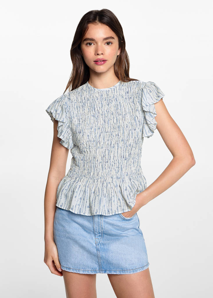 Frilled-sleeve ruched blouseCurrent price [US$ 45.99 ]US$ 45.99Select a colourOff WhiteSelect your sizeXXSXSSMLDimensionsAdd to WishlistSee lookFree delivery to storeElastic ruching. Straight design. Frills ending. Short-sleeved ruffle. Back slit detail. Button closure at the back. Viscose fabricDetails, composition and careStore availability