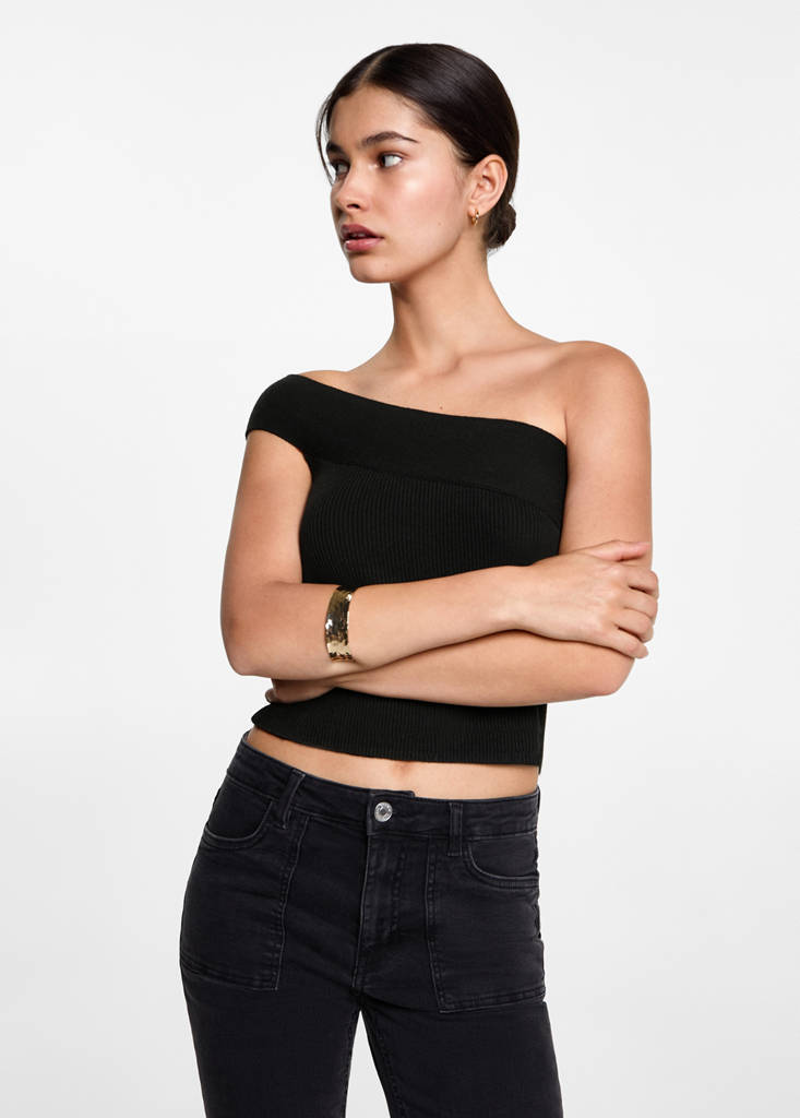 Party and events collection. Off-shoulder design. Crop design. Asymmetric design. one sleeve. No Fastening. Sleeveless. Slim fit. Fine knit fabric. Straight Design
