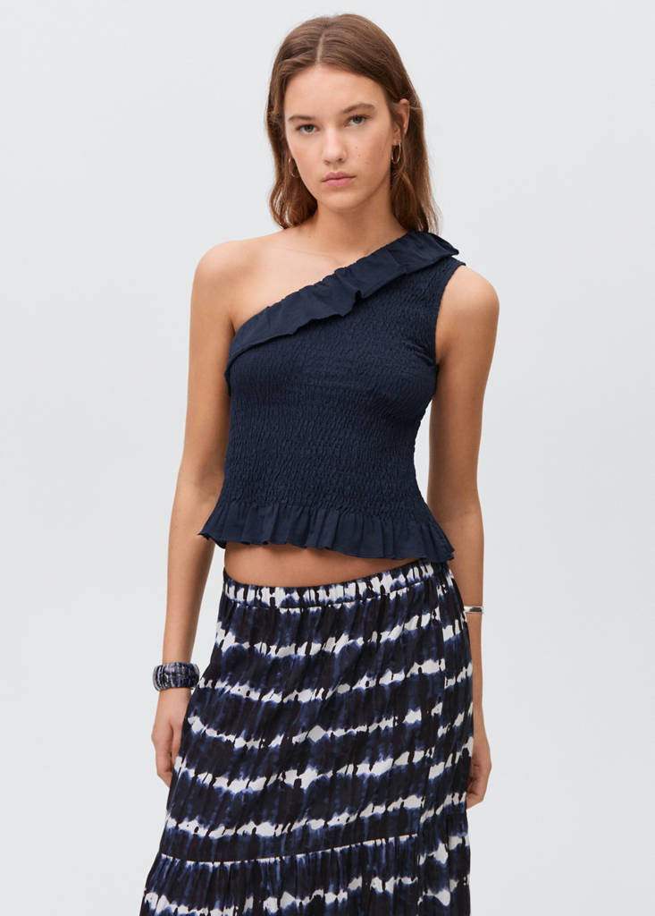100% cotton fabric. Asymmetric design. Asymmetric neckline. Asymmetrical shoulder strap. ruffled shoulder strap. Honeycomb pattern. Frill on the bottom. Without inner lining