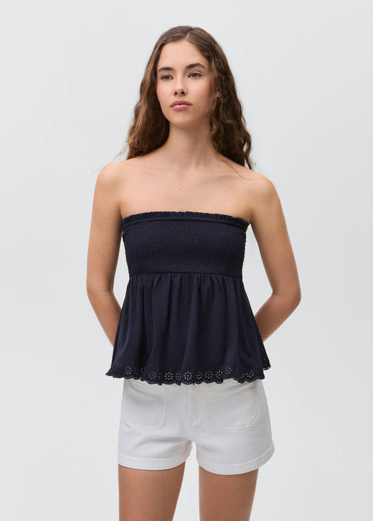 Ruffled topCurrent price [US$ 29.99 ]US$ 29.99Select a colourDark NavySelect your sizeXXSXSSMLAdd to WishlistSee lookFree delivery to storeStraight Silhouette. Round Lapel Collar. Medium Flat Structure. Crop LengthDetails, composition and careStore availabilityItem qualitiesRecycled cottonAt least 20%This fibre is obtained from pre- and post-consumer textile waste that is transformed into new fabrics.