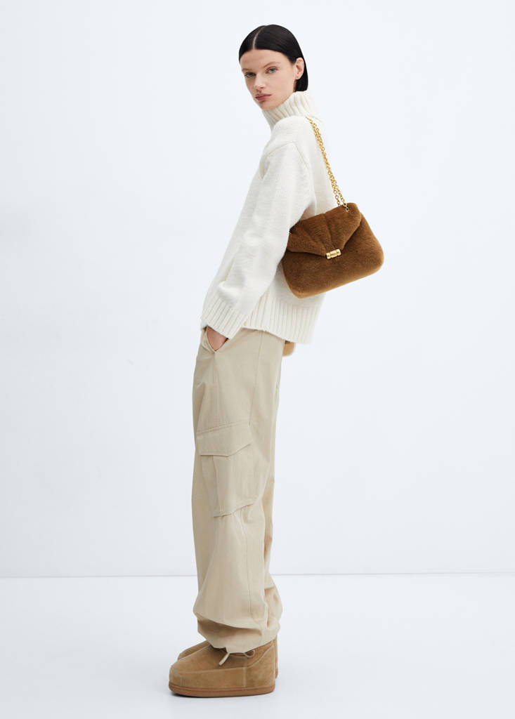 Faux fur effect. Large. Crossbody bag. Quilted design. Long detachable chain strap. Double main compartment with zip closure. Flap closure with magnetic button. Inner lining