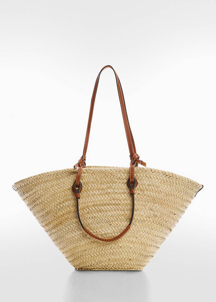 Large. Raffia fabric. Leather details. Two short handles. Two long handles. Inside bag. Zip fastening. Metallic buttons