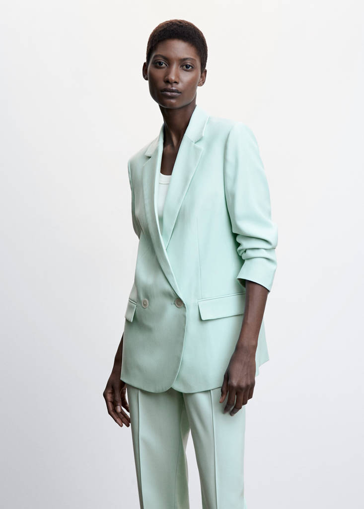 Straight design. Long design. Structured design. Lapel-collar V-neck collar. Lapel with notch. Long sleeve with buttoned cuffs. Shoulder pad. Two pockets with flaps. Welt pocket. Back-slit hem. Inner lining. Double button fastening. Co-ord. Plus Size Available. Online Exclusive. Party and events collection