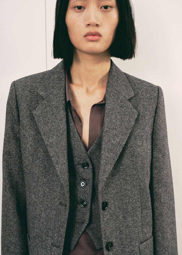 Suit style. Wool mix fabric. Speckled jacquard. Straight design. Lapel-collar V-neck collar. Lapel with notch. Long sleeves with buttoned cuffs. Two front patch pockets. Back vent at the hem. Front closure with buttons. Inner lining. Total look. Available Plus