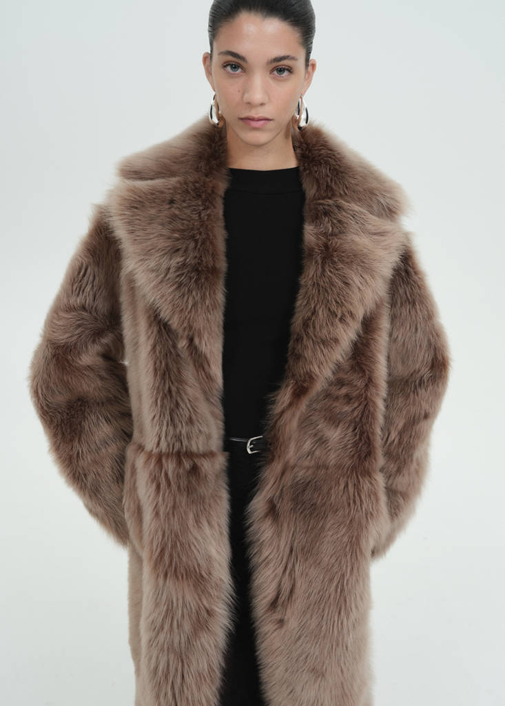 100% sheepskin. Fur. Long design. Straight design. Reversible design. Notched lapel collar. Lapel with notch. Long sleeves. No Fastening. Selection Collection. Party, ceremony and communion collection. This garment belongs to our event collection, designed to make you the perfect guest at any party, wedding or ceremony