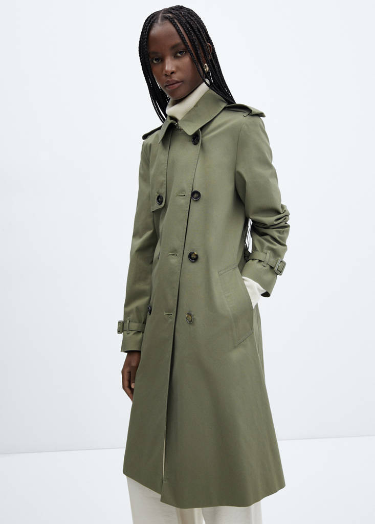 Standard design. Slim fit. Water-repellent: The durable finish of this garment protects against light rain, repelling contact with water and raindrops. Straight design. Medium design. Notched lapel collar. Long sleeves. Loops on the cuffs. Two side pockets. Adjustable belt. Back vent at the hem. Button fastening at the front. Tortoiseshell effect buttons. Inner lining. One of the colours is an online exclusive. Available Plus. The blue colour is an online exclusive. Office looks. 100% cotton fabric. Wrap design