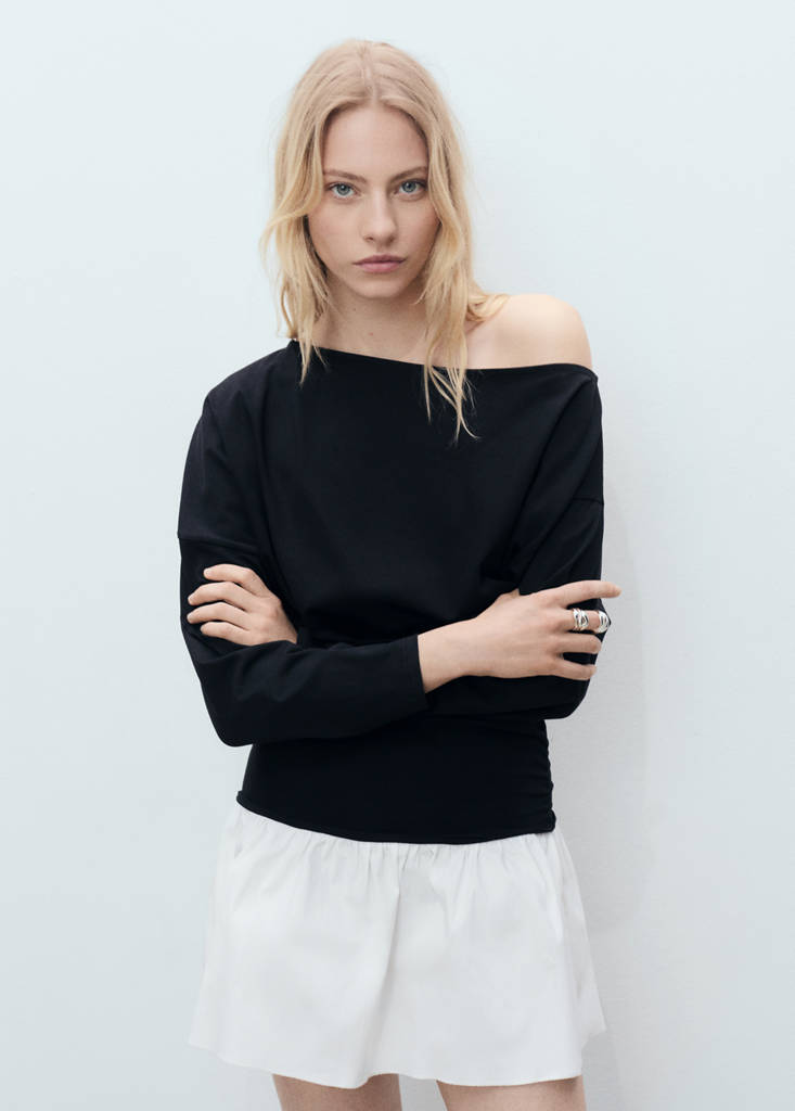 Cotton fabric. Short design. Combined design. Fitted design. Asymmetrical neckline. Long sleeves. Draped waist. Ruffle hem